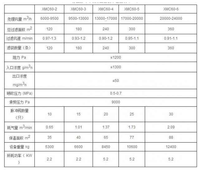xmc脈沖布袋除塵器型號(hào)技術(shù)參數(shù):