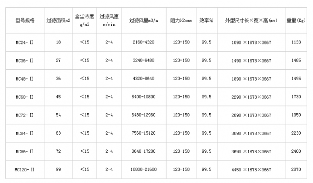 MC型脈沖布袋除塵器的型號(hào)參數(shù):