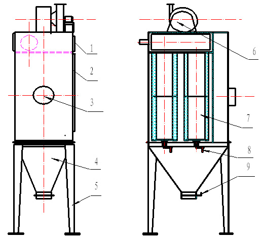 序號 名稱 序號 名稱 1 上門 6 風(fēng)機 2 下門 7 濾芯 3 進(jìn)風(fēng)口 8 調(diào)節(jié)杅 4 灰斗 9 閘板 5 支腿